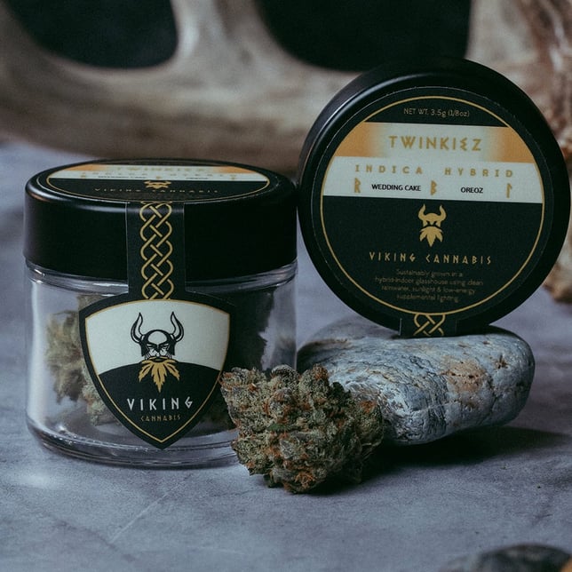 Twinkiez is Viking's sweet-tooth indica — a high-THC dessert cultivar with a flavor arc that lives up to the name. Sugary vanilla and cream lead, a chocolatey cookie middle follows, and a subtle diesel-pepper finish keeps it from feeling one-note. Grown in our Dutch greenhouses under sun and precision hydroponics, Twinkiez splits the difference between Wedding Cake's body-melting calm and Cream Cookiez's balanced euphoric lift. The result: a happy, creative headspace that gives way to full-body relaxation. Versatile enough for a social afternoon, potent enough to settle into evening — ideal for stress relief and quieting a busy mind.