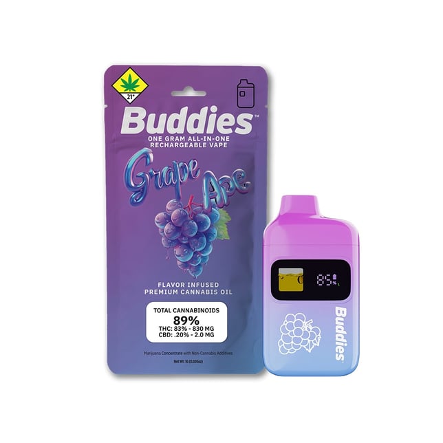 With Buddies Flavor Infused 1g All-In-One vapes, there’s nothing to forget and everything to enjoy. Providing all you’ll need for a gram’s worth of pleasurable puffs, our all-in-one vapes match reliable, discrete hardware with a formula that’s rich in premium cannabis oil and impeccably flavored with a refreshing variety of natural plant-based terpenes. From Grape Ape to Raspberry Parfait, Buddies Flavor Infused All-In-Ones pair fantastic flavors with maximum convenience for a product your pocket won’t want to be without.