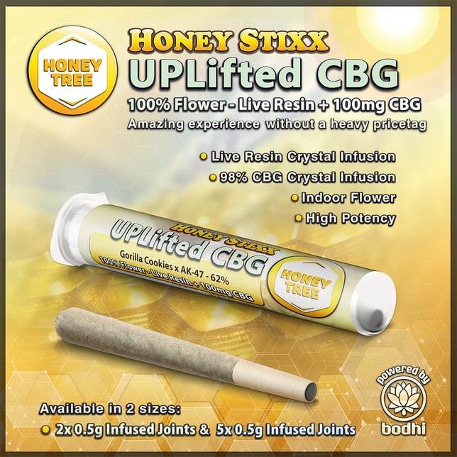 The Honey Stixx Uplifted CBG-Infused Joint combines CBG, a cannabinol known for its uplifting and energetic properties paired with a curated Sativa blend terpenes, live resin and indoor-grown flower. This unique blend may reduce anxiety, while increasing energy and focus, offering a warm and inviting experience thanks to the synergistic interaction of potent terpenes and cannabinoids.