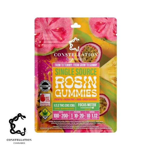 Our Pineapple, Passionfruit, Guava, and Green Tea gummies serves up a tropical burst of flavor made with real ingredients you can actually pronounce. Created by the family-owned and operated team at Constellation Cannabis our gummies are powered with our signature, award winning single-source hash rosin and a dynamic 1:2:2 THC:CBC:CBG ratio. Rated very high on our Focus Meter, these gummies are designed to sharpen your mind, spark creativity, and keep you dialed in without the jitters. Infused with green tea, a natural source of antioxidants known for supporting sustained energy, mental clarity, and overall cognitive balance, this gummy offers a clean, uplifting boost that feels as good as it tastes. Each piece is also formulated with our vegan, gluten-free recipe that keeps things vibrant, functional, and deliciously empowering from the first juicy bite to the last wave of focus.