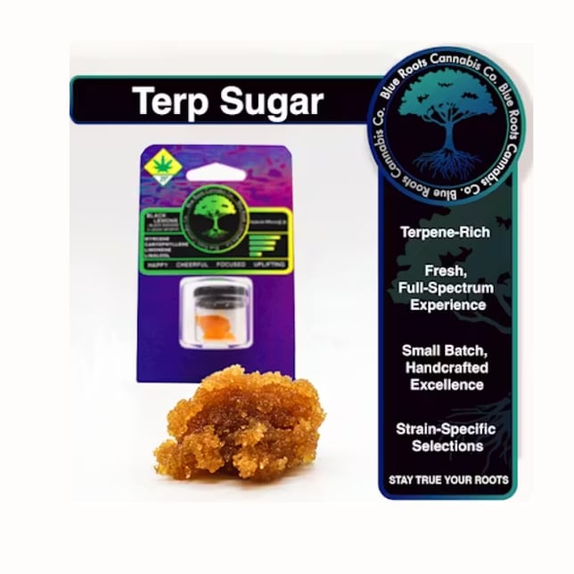 Elevate your dabs with our small-batch, in-house Terpene Sugar, crafted from 100% Blue Roots flower for unmatched flavor. Each sparkling crystal is loaded with full-spectrum terpenes, delivering a clean, vibrant taste that turns every hit into a terp-rich masterpiece.