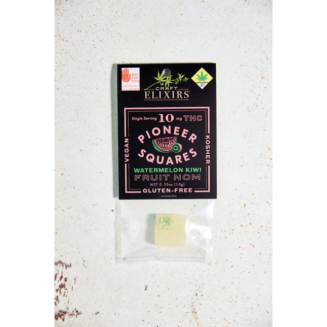 PIONEER SQUARES Watermelon Kiwi THC gummies are gluten-free, vegan and Kosher. Candied artisan fruit candy chew. We start with a tart watermelon candy chew and add a sweet candied Kiwi in the middle.