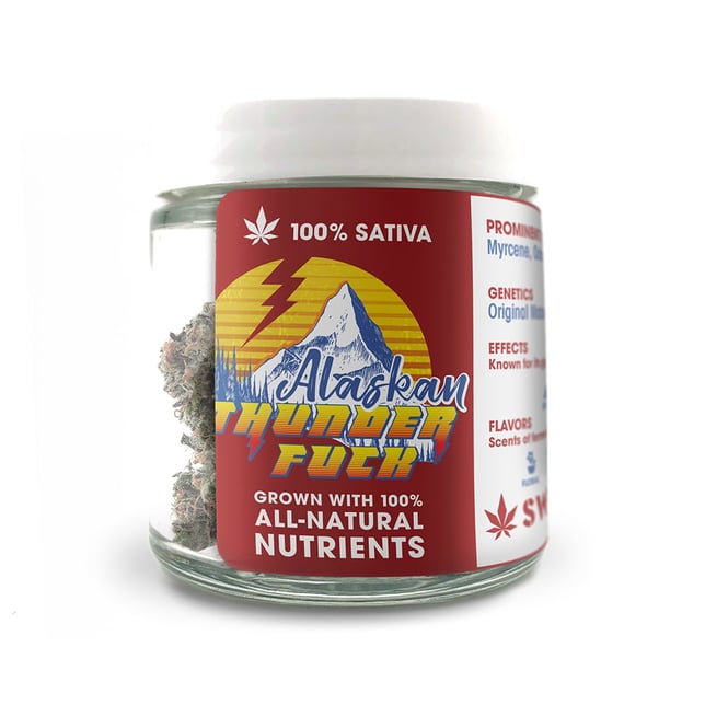 Alaskan Thunderfuck, or ATF, is an extremely potent Sativa strain originating from Alaska's Matanuska Valley where locals simply call it "Thunder." This storied, fruity, pine and chocolate hybrid often delivers its effects during the first exhale with consumers usually needing only 1-2 hits before experiencing the legendary face-twisting head high and hungry, total body relaxation.